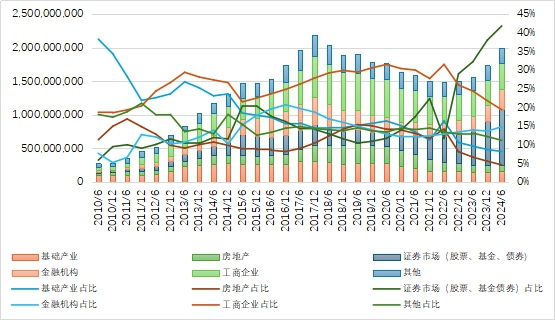 從資金信托投向結構來看,信托資金投向證券市場(含股票、基金、債券)的規(guī)模合計為8.34萬億元,較2023年4季度末增加1.74萬億元,該部分資金投向在資金信托總規(guī)模中合計占比為41.81%,與2023年同期相比,規(guī)模增加3.28萬億,同比上升64.89%,占比提升近9%。