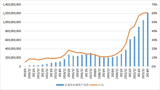 2024年2季度末,資金信托中,交易性金融資產投資規(guī)模達到12.10萬億元,占比為60.66%。較2023年4季度末增加1.66萬億元,占比增加0.56%;與2023年同期相比,規(guī)模增加3.12萬億元,同比增速為34.68%,占比上升3.42%。同時,信托公司也在積極探索長期股權投資、債權投資、同業(yè)存放、買入返售等多樣化的金融工具運用。