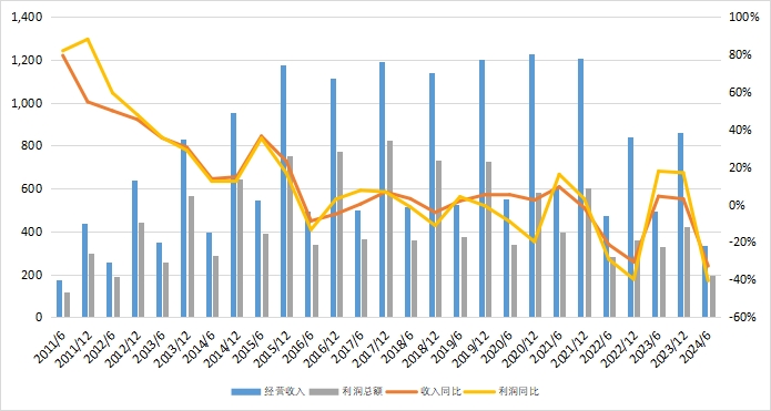 經營收入和利潤總額方面,與2023年同期相比,均出現明顯下滑。截至2024年2季度末,行業(yè)實現經營收入332.53億元,同比下降32.73%;利潤總額195.88億元,同比下降40.63%。