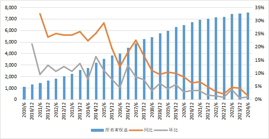 所有者權益方面,與2023年同期相比,整體規(guī)模略有增加。截至2024年2季度末,信托公司所有者權益規(guī)模達到7554.22億元,較2023年4季度末增加69.07億元,較2023年同期增加105.26億,同比增速1.41%。